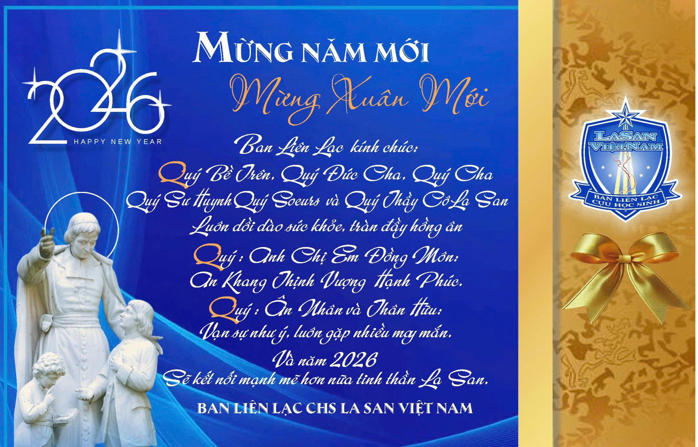 Trong niềm vui trọng thể mừng Chúa Xuân và đón chào Năm Mới 2026, Ban Liên Lạc Cựu Học Sinh La San Việt Nam xin được hiệp thông cùng Quư vị để dâng lời tạ ơn Thiên Chúa v́ muôn vàn Hồng ân Người đă tuôn đổ xuống trên Đại Gia Đ́nh La San chúng ta trong suốt năm qua.