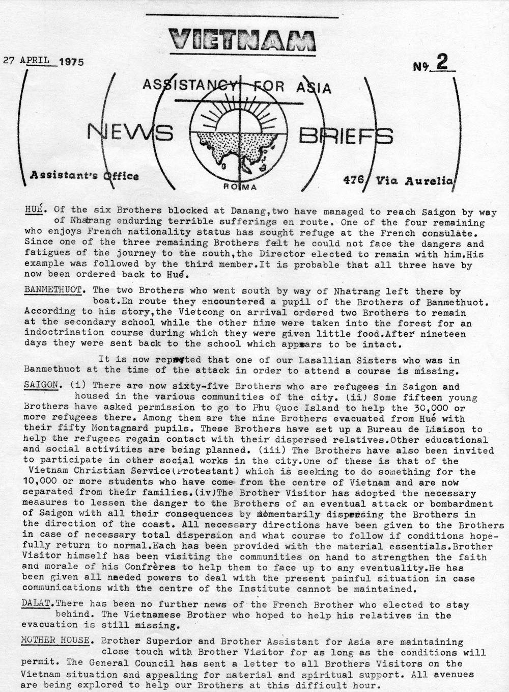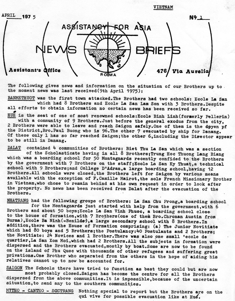 Ban Lănh Đạo Trung Ương Ḍng La San, tại Nhà Mẹ, Roma, theo dơi t́nh h́nh chiến sự và thông tin đến tất cả các Anh Em đồng môn trên thế giới: